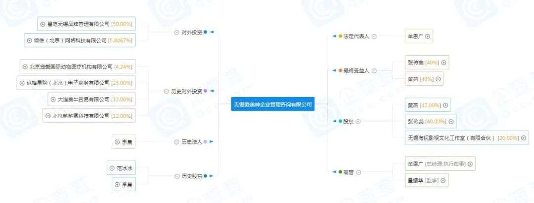 根据企查查信息显示,北京纵横星购目前的唯一股东为星购(天津)科技有限公司(下称天津星购科技),后者的实际控制人是持股65.23%的刘仕儒。而范冰冰先后曾通过持股的无锡爱美神企业管理咨询有限公司(下称爱美神)以及控股98%的北京美丽宫文化交流有限公司(下称北京美丽宫,范冰冰为企业法人),参股过北京纵横星购。