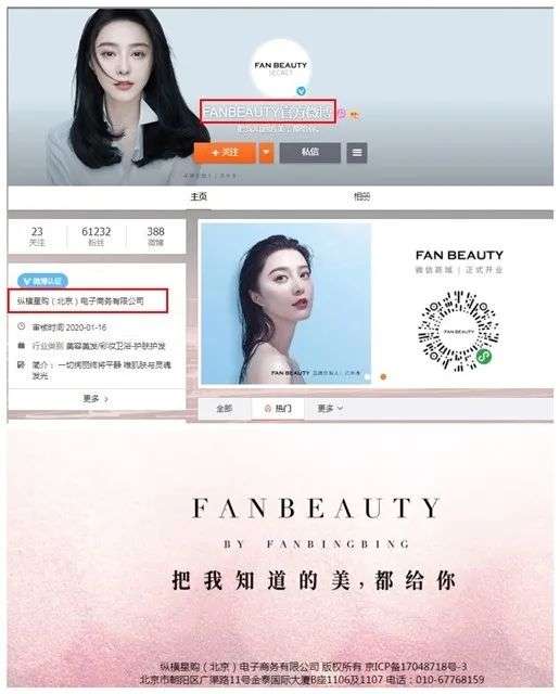 众所周知,FAN BEAUTY自诞生以来,一直对外宣称为范冰冰的自创美妆品牌;并且,FAN BEAUTY的官网版权和品牌官方微博的认证,均为北京纵横星购;范冰冰也的确曾通过旗下控股公司投资了北京纵横星购。不仅如此,“FAN BEAUTY 品牌为范冰冰亲研”等相关推广宣传也充斥着网络。