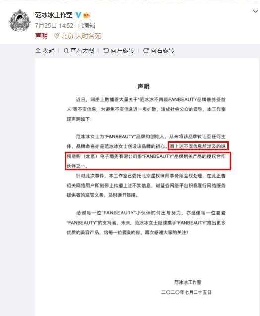 因此,今年7月“范冰冰不再是FAN BEAUTY品牌最终受益人”的言论就开始网上流出,7月25日,范冰冰工作室也立即在微博上进行了辟谣并发布声明称,“范冰冰为FAN BEAUTY品牌的创始人,从未将该品牌转让至任何主体”,同时该声明还表示,“北京纵横星购系‘FAN BEAUTY’品牌相关产品的授权合作伙伴之一。”