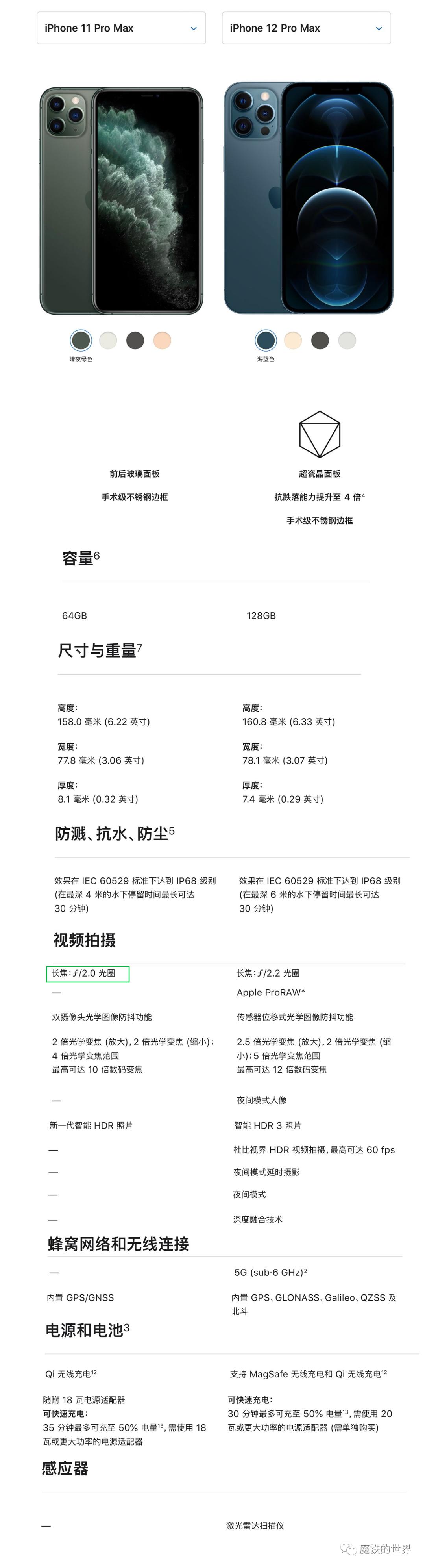 而相比iPhone 12 Pro,真正属于iPhone 12 Pro Max独享的升级更是不多,仅有长焦摄像头用传感器防抖,以及变焦倍数增加。为了这两项功能,用户需要多付800元,具体差别见下图。