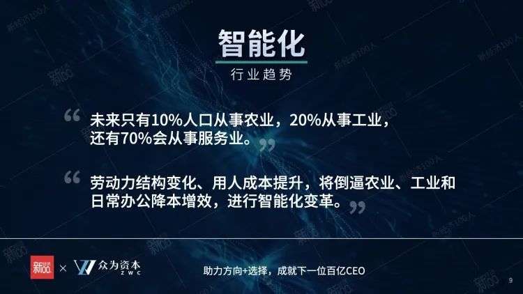 智能化时代来临,我认为有两个重要的原因,首先是人口结构的变化,人口红利结束后,我预测未来农业从业人口会占到整个劳动力人口的10%,工业占20%,还有70%的劳动力会从事精神消费领域以及服务业,即所谓的第三产业。