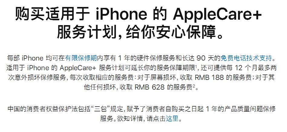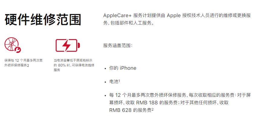具体来看,AppleCare+ 计划包括,每部iPhone均可在有限保修期内享有1年的硬件保修服务和长达90天的免费电话技术支持。另外,适用于iPhone的 AppleCare+ 服务计划还可延长用户的服务保障期限,提供每12个月最多两次的意外损坏保修服务。每次损坏维修收取相应的服务费:对于屏幕损坏,收取188元的服务费;对于其他任何损坏,收取628元的服务费。