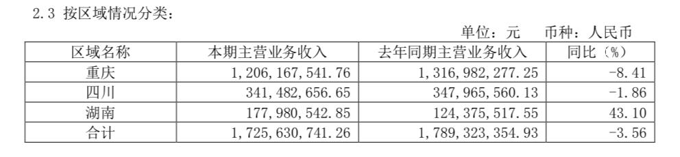 另外,财报显示,重庆啤酒近三年的销售市场也仅有重庆、四川、湖南三个区域,且重庆地区的营收额占总营收一直稳定在70%以上。