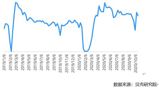 贝壳研究院数据显示,10月12日-18日链家重点18城二手房实际成交环比减少9%。从图中可以看出,国庆黄金周过去以后,市场成交量重回低位波动趋势。