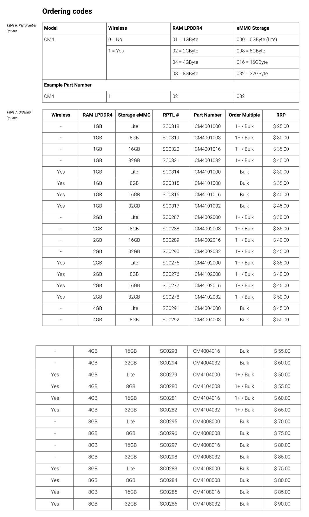 因为这次的计算模组有多种 RAM、闪存和无线连接选项,所以共计有 32 种不同版本。价格也从 25 美元(1GB RAM,无 WIFI 功能)一直到最高 90 美元(8GB RAM、32GB 闪存加 WIFI 功能)不等。