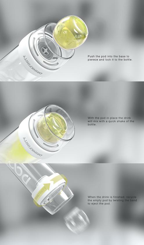 2018年,百事曾推出一款“Drinkfinity”便携饮料,“豆荚”中含有浓缩果汁、固体粉末等物质,将瓶中灌满饮用水,“豆荚”放在瓶口,释放,便是一整杯果汁。
