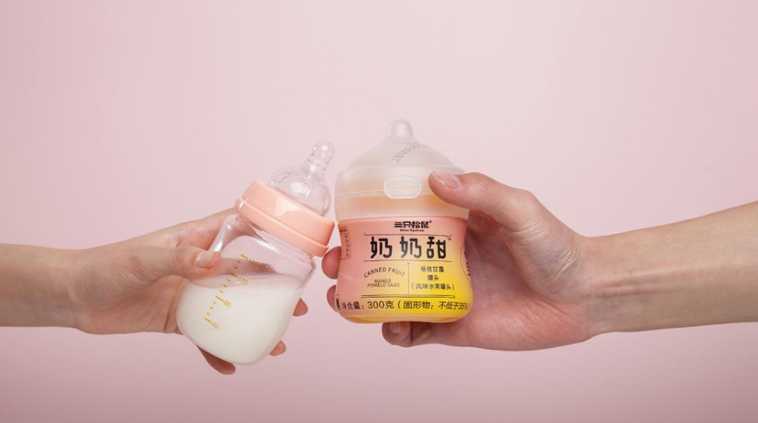 三只松鼠这款“奶奶甜”水果罐头,主打童趣定位,将瓶盖设计成了奶嘴。一瓶拿在手中,满满童心放佛要从奶嘴中溢出来了。