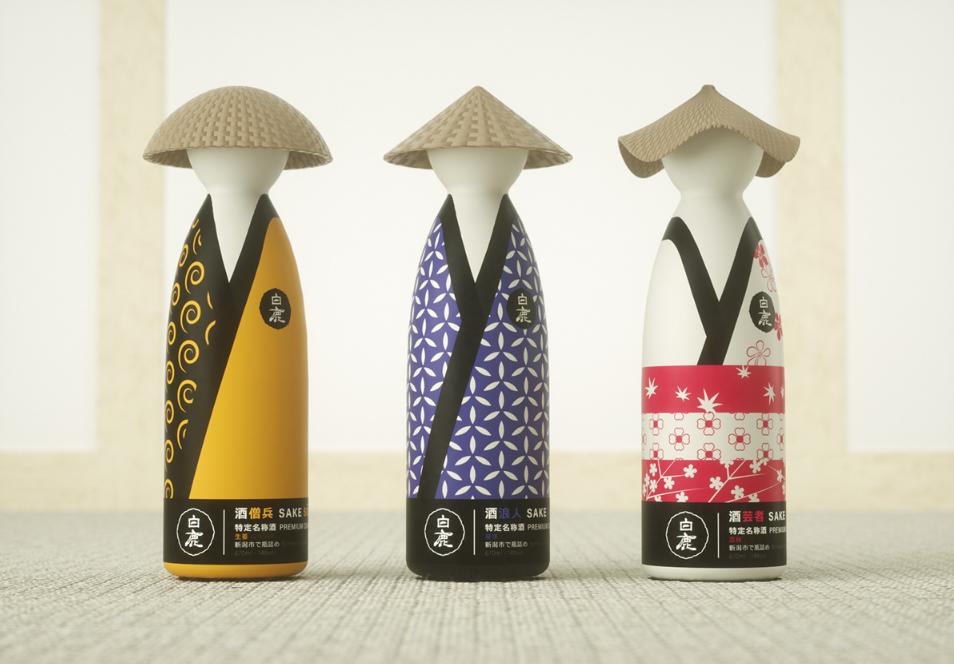 这款日本白鹿清酒,瓶身是穿着日本传统服饰的农夫,瓶盖就是他们头上的“斗笠”。整个设计极其和谐而优美。