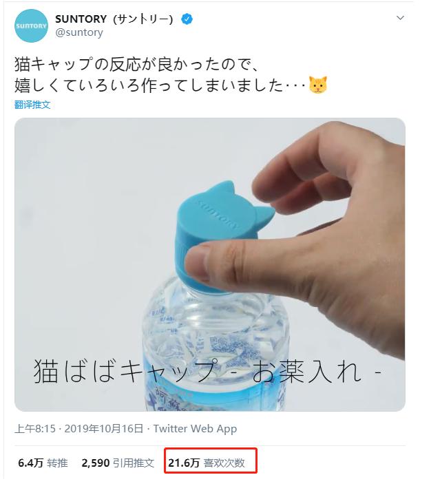 当年10月,三得利又一次性推出8款升级版“猫咪瓶盖”,让瓶盖兼具药盒、存钱罐、按摩器等多种功能。引起了网友们的热烈讨论,三得利官方推特中,当条推文点赞数达到21.6万,而三得利日常推文的点赞数只在400左右。可以说,这一次“瓶盖创意”,让三得利品牌的关注度暴涨500倍。