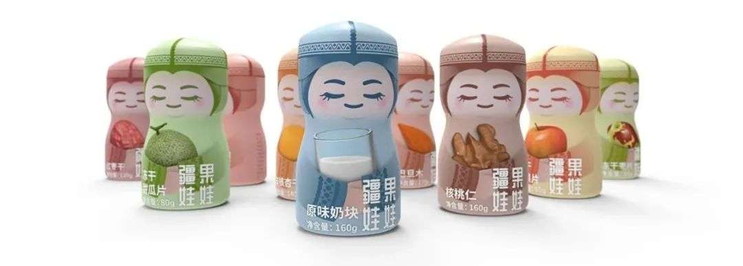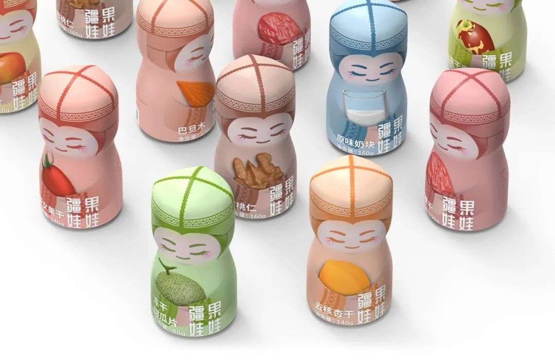 同样是将瓶盖作为人物头上的帽子,这款新疆特产“疆果娃娃”果干,采用了极具新疆民族特色的瓶子设计。这款设计也夺得了2020Pentawards食品类铜奖。