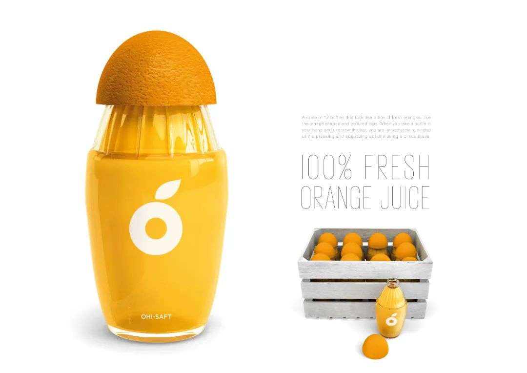 还可以将瓶盖设计成一个小泵,掀开瓶盖的过程,就如同从瓶中“榨”出果汁。