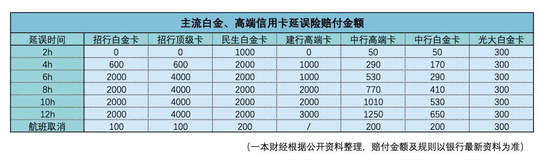 比如民生银行的豪华白、无限、钻石、百夫长白金黑金等信用卡,只要延误2小时,就定额赔付1000,如果超过4小时,金额则达到了2000。