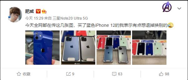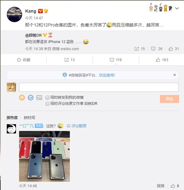 目前网络上传播的iPhone 12蓝色有好几个版本,根据数码博主@Kang的微博来看,他认为网络上流传的iPhone 12和iPhone 12 Pro色差过大,并且由于传播次数过多,照片画质不断压缩,压缩越厉害,色差就越明显。也有不少购买到iPhone 12机模的用户表示,自己所拿到的iPhone 12蓝色与官网的差距并不大,很有可能是由于iPhone 12采用的是亮面玻璃设计,导致其在光线较好的情况下会出现反射光的情况,所以使得看起来iPhone 12的蓝色看起来更加的艳丽,而不是官网上的灰蓝风格。