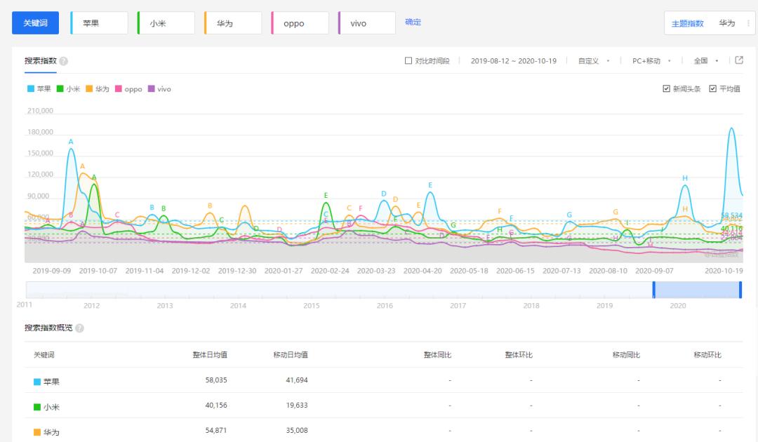 其实不光是配色,之前iPhone 12系列就曾因垂直边框、摄像头、雷达等特性上过好几次微博热搜第一,一次又一次的热搜第一也证明苹果在中国的热度依旧是其他手机厂商所不能相比的。从近一年的百度指数来看,苹果的整体搜索次数完全碾压国产厂商,就算是近两年势头正猛的华为也要被苹果压一头。