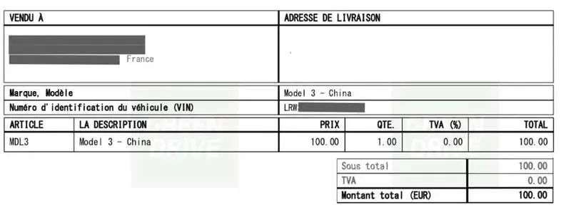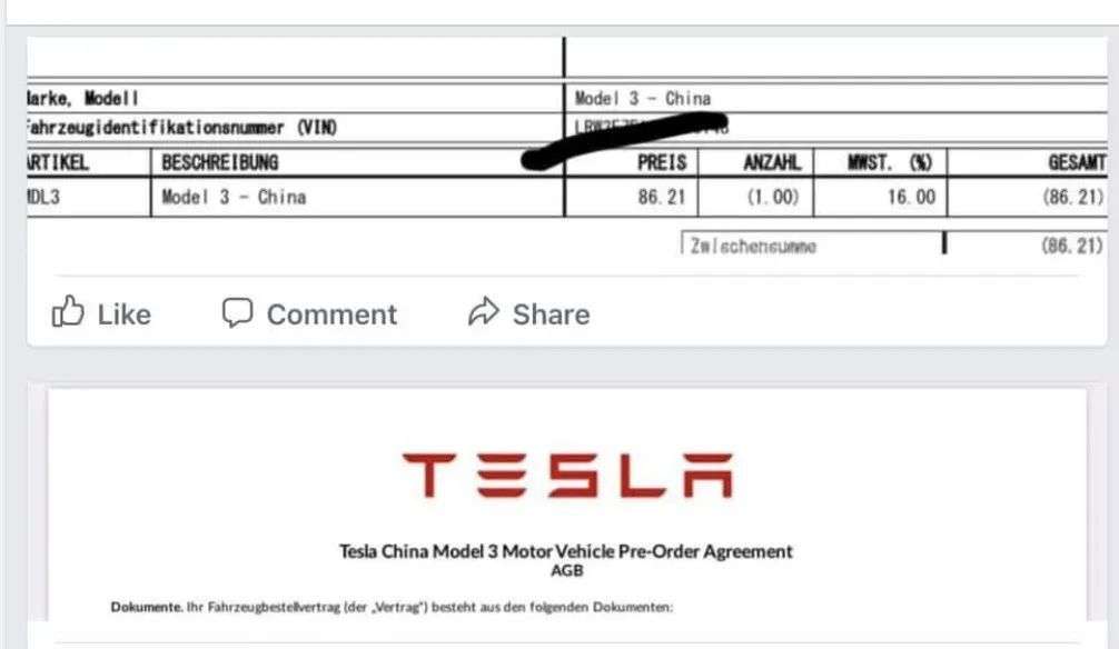 除了法国,德国、意大利陆续也有车主晒出了“Model 3-China”的发票。