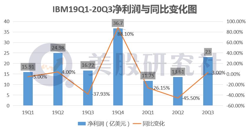 美东时间10月19日盘后,IBM对外发布2020财年第三季度的财报,财报公布后,刺激其股价在盘后交易中下跌约3%。虽然其股价下跌不无受三大股指集体下行的影响,但高于大盘的跌幅也表明了资本市场对这份财报的态度。截至美股研究社发稿,IBM盘后每股报121.88美元,盘后下跌2.90%,总市值为1117.85亿美元。