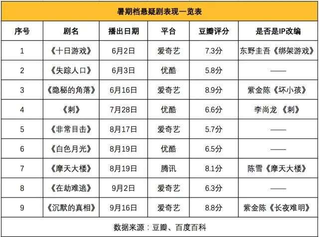 这在悬疑作品中表现更为表现,今年作为悬疑剧的大年,就暑期档三大视频平台就推出9部悬疑短剧集,4部口碑最好的作品都是改编而来。《十日游戏》由东野圭吾小说《绑架游戏》改编,《隐秘的角落》和《沉默的真相》改编自紫金陈小说《坏小孩》和《长夜难明》,《摩天大楼》改编自作家陈雪同名小说。