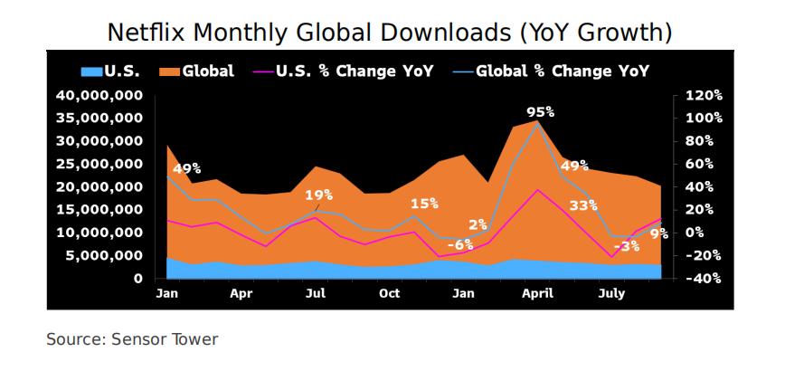 彭博分析师认为,新增用户放缓或不足为患。奈飞三季度全球下载量与去年持平。虽然疫情红利终将褪去,但是其优质的内容足以支撑起护城河。新剧《Stranger Things》以及《La Casa de Papel》吸引了680万新用户。尽管竞争激烈,北美下载量环比也只降低了5%。