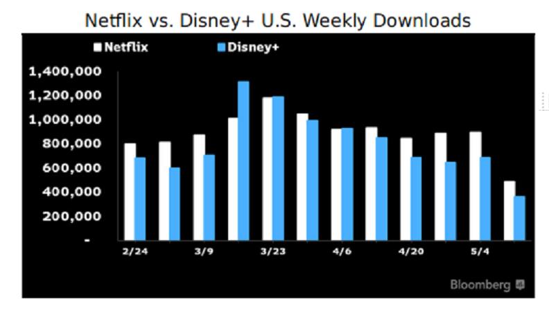 值得注意的是,流媒体赛道竞争愈发激烈,抢用户大战也如火如荼。以Disney +为例,其2019年11月12日上线,5个月后,用户就突破了5000万。耕耘20余年的奈飞用了7年时间才达到这样规模的用户量。6.99美元/月的低价(奈飞为13美元/月)及更加适宜儿童的内容,迪士尼实力不容小觑。以5月上半月为例,Disney + 美国本土下载量为 125.5万,直追奈飞的160万。