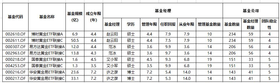 如果将A和C份额看做一个基金,那么规模最大的仍然是博时黄金ETF联接基金,总规模为57.4亿,比第二名成立年限最长的华安黄金易ETF联接基金(7.2年)略微高出0.6亿。