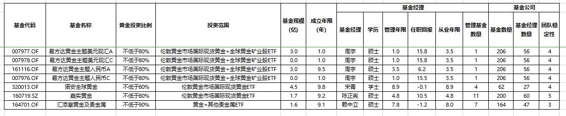 本次统计中,共有7只黄金主题基金,其中,易方达的4只基金主要投在跟踪伦敦交易所国际现货黄金的ETF和跟踪全球黄金矿业股票的主动基金。此外,这4只基金分为美元份额和人民币份额。基金对黄金的投资比例不低于80%。