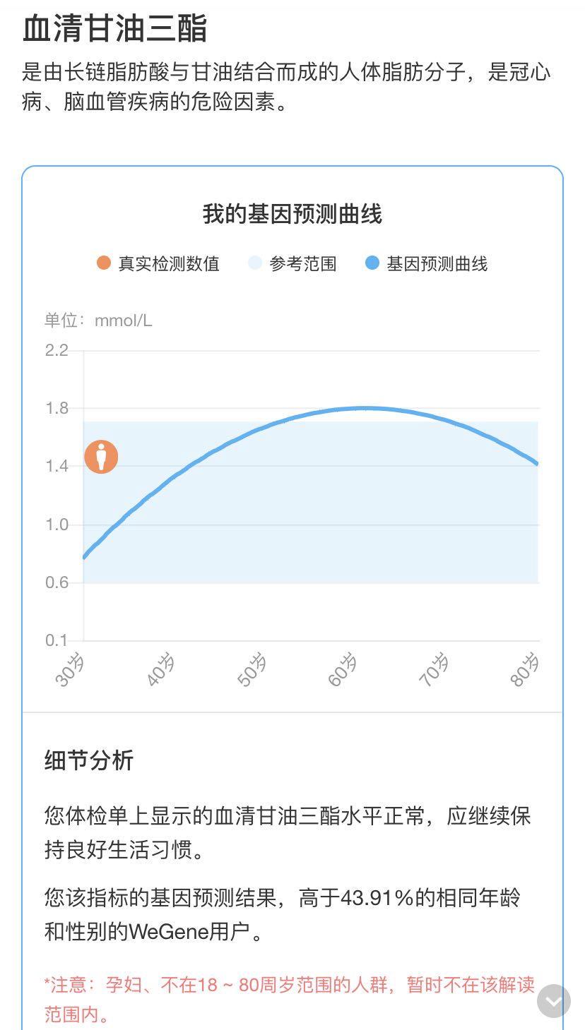基因+体检:体检结合基因数据,可以综合内因外因,系统精准地进行健康管理。比如微基因用户上传体检单数据,能够预测体检指标随年龄的变化趋势,更有针对性地进行生活行为调整。