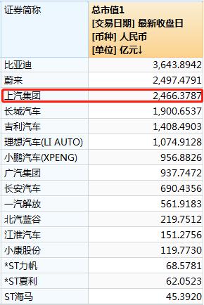 截至发稿前,上汽集团市值约2400亿元,落后蔚来汽车100亿元,而落后比亚迪已达千亿之多。