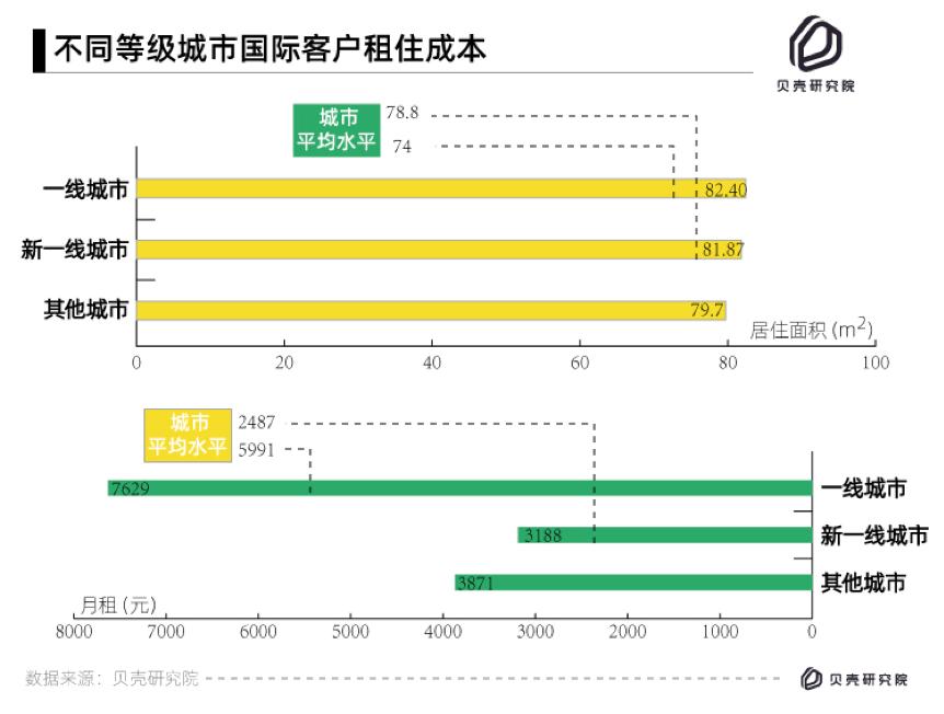 外国人在中国一线城市租房套均支出7629元/月,新一线城市套均支出3188元/月;而城市平均水平一线城市4307元/月,新一线城市2078元/月,在租房居住上,外国友人更舍得花钱。