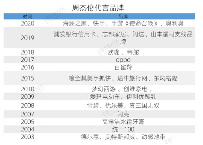 周杰伦代言品牌的不完全统计,来源:CBNDaata星数罗盘