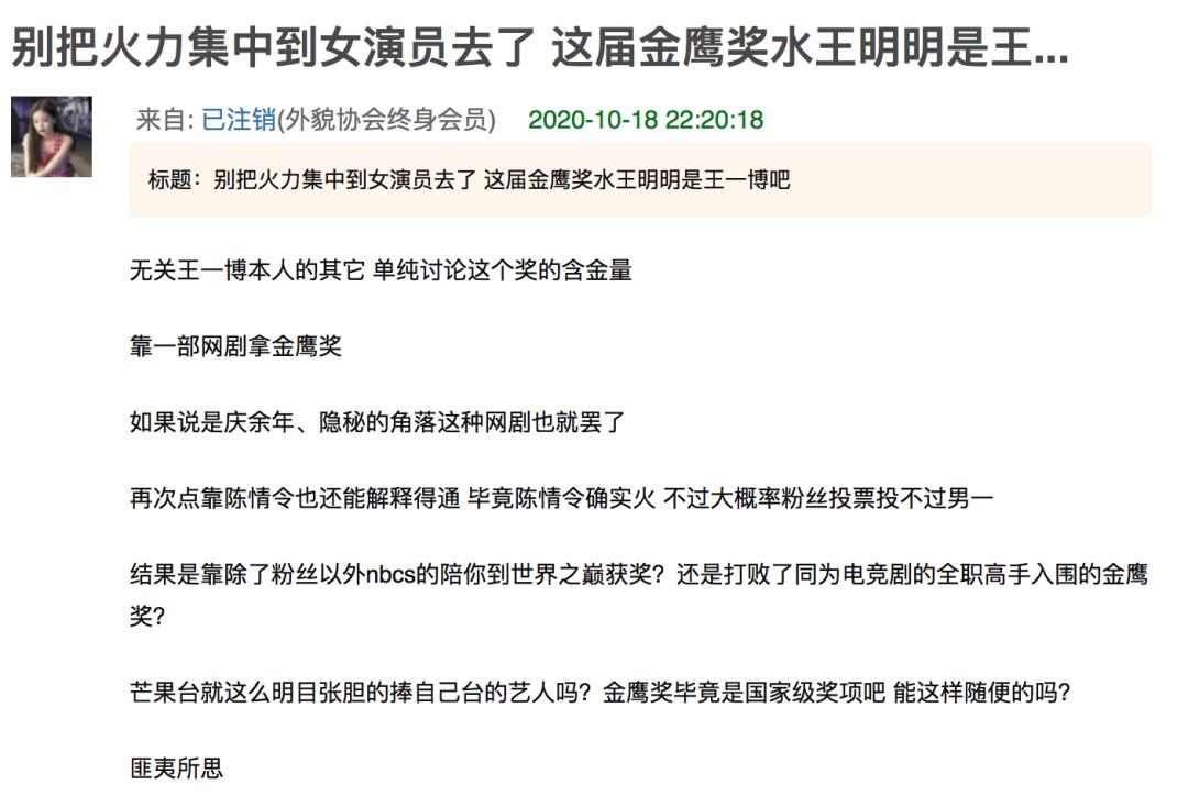 在毒眸看来,观众对颁奖结果缺乏讨论热情的重要原因恐怕是:观众已经看不懂金鹰奖评选规则了。豆瓣小组里,大量帖子就奖项规则发问,还有网友直接发私信给年颁奖礼总导演王琴的工作室官微提问:“章程一直没有,明确一下这么难吗?”