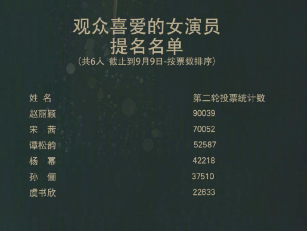 此前提名女演员中领跑的宋茜由91.8万票被清到了38.9万票,而赵丽颖、谭松韵在数据更新后票数不降反升,分别以86.7万票和41.1万票反超宋茜位列一二名。