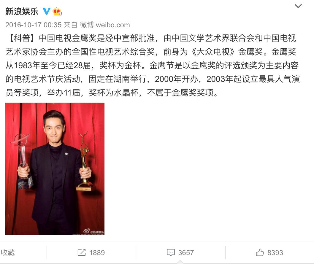 但这并不是因为观众对金鹰奖缺乏关心:18日当晚在湖南卫视播出的颁奖礼CSM52收视破1,同时段夺冠,相关微博热搜数十条,金鹰女神之争、观众喜爱奖清票风波都获得了热议。