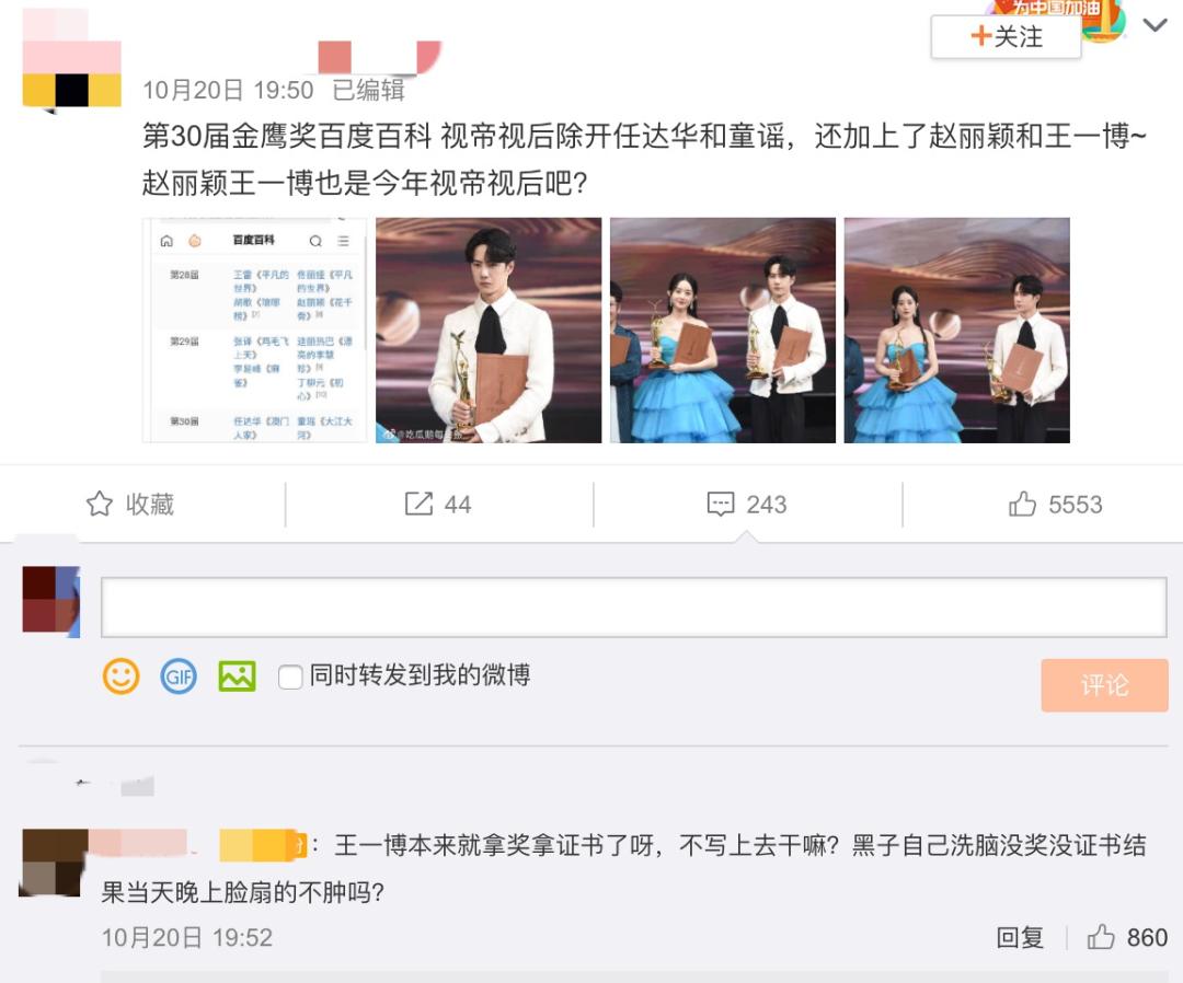 而近年的金鹰奖,不仅让越来越多演技争议更大的流量艺人拿下人气奖,甚至沾指专业奖,公信力下滑似乎也并不冤枉。上届迪丽热巴拿奖被广泛质疑,今年尽管讨论度不高,在知乎上,仍有不少观点认为王一博拿奖有失公允。