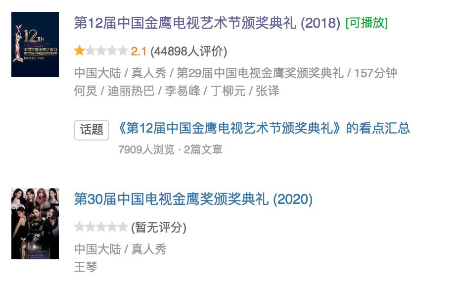 也没什么网友因此批评金鹰奖。豆瓣上,第30届金鹰奖由于评分人数不足,至今未显示评分,与上届惨烈的2.1分相比,堪称风平浪静。