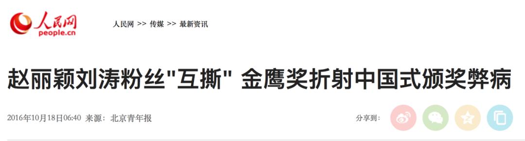 这次赵丽颖、刘涛的视后之争让金鹰奖被主流媒体批评“奖单取向含混不清”、“在严肃的原则性问题上打太极,跟提名者和观众开了大大的玩笑。”