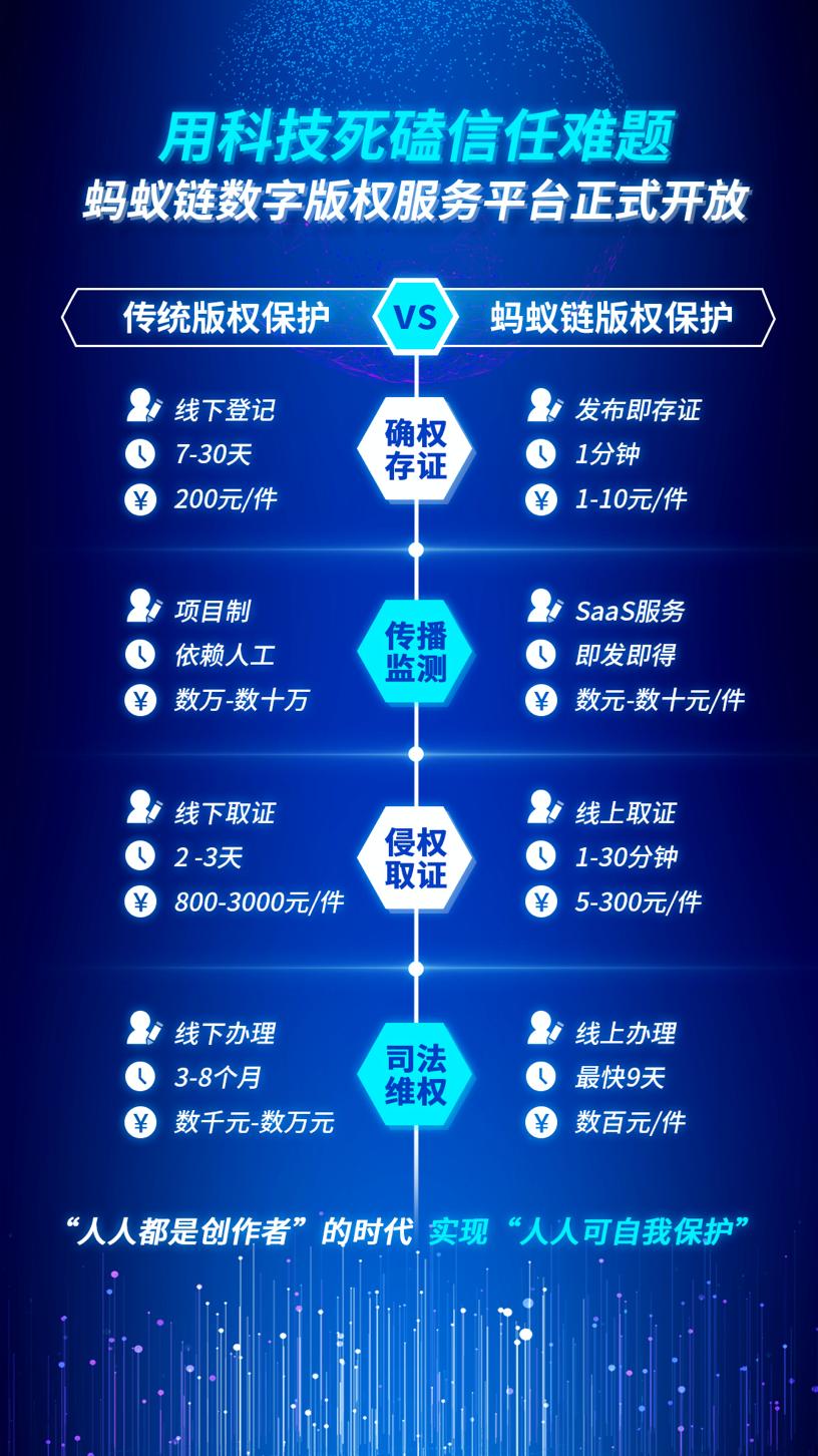 据蚂蚁链版权业务负责人刘劲雄介绍,与传统版权保护相比,蚂蚁链数字版权服务平台的保护链路更清晰,且相关费用节省95%以上,大大降低了版权保护门槛。