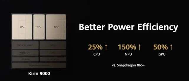 GPU方面,这颗麒麟9000配备的是全新的ARM Mali-G78 MP24,这是全球首个拥有24核心的移动图形处理器,相对于骁龙865+,性能提升52%。整体的能耗比也比骁龙865+有最低25%的提升。