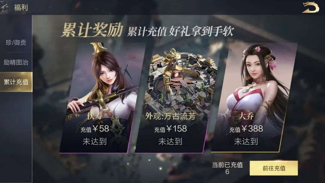 《鸿图之下》的累计充值奖励,可以看出基本商业化的点一样是抽卡,外观等,这个画风说实话真是你说是换皮游戏的广告素材我也信。