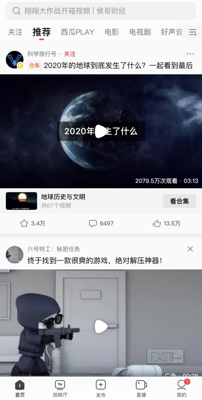 自身内容生态层面,打开西瓜视频首页,“搜索、关注、推荐、放映厅、直播”的内容分发方式。