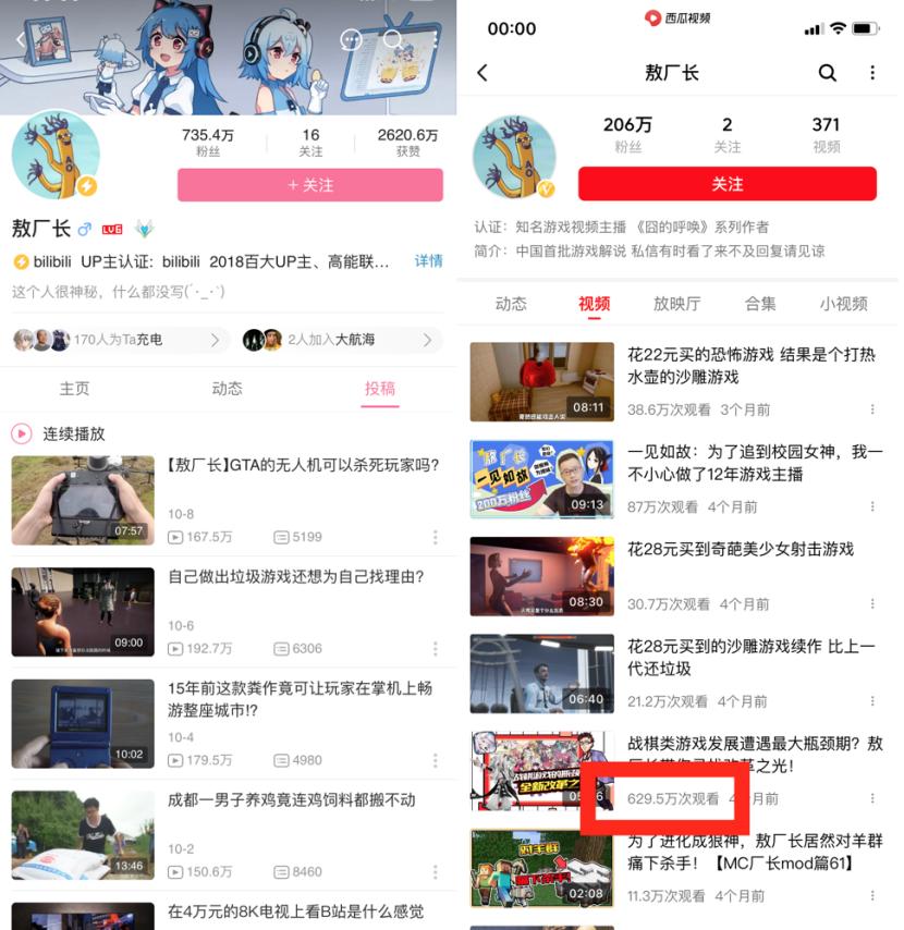 打个比方,回归B站的敖厂长,他在B站的粉丝数量是735.4万,近半年的作品观看量基本都在百万级别;但在西瓜的情况就不太一样了,206万粉丝,播放量情况不稳定,区间跨度很大,从一万到二、三十万到五六百万不等。