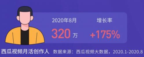 据西瓜视频提供的《中视频创作人职业发展报告》,截至2020年8月,西瓜视频月活创作人数量达320万,距年初增长175%,今年以来,平均每天有超过8000人加入西瓜视频创作人行列。