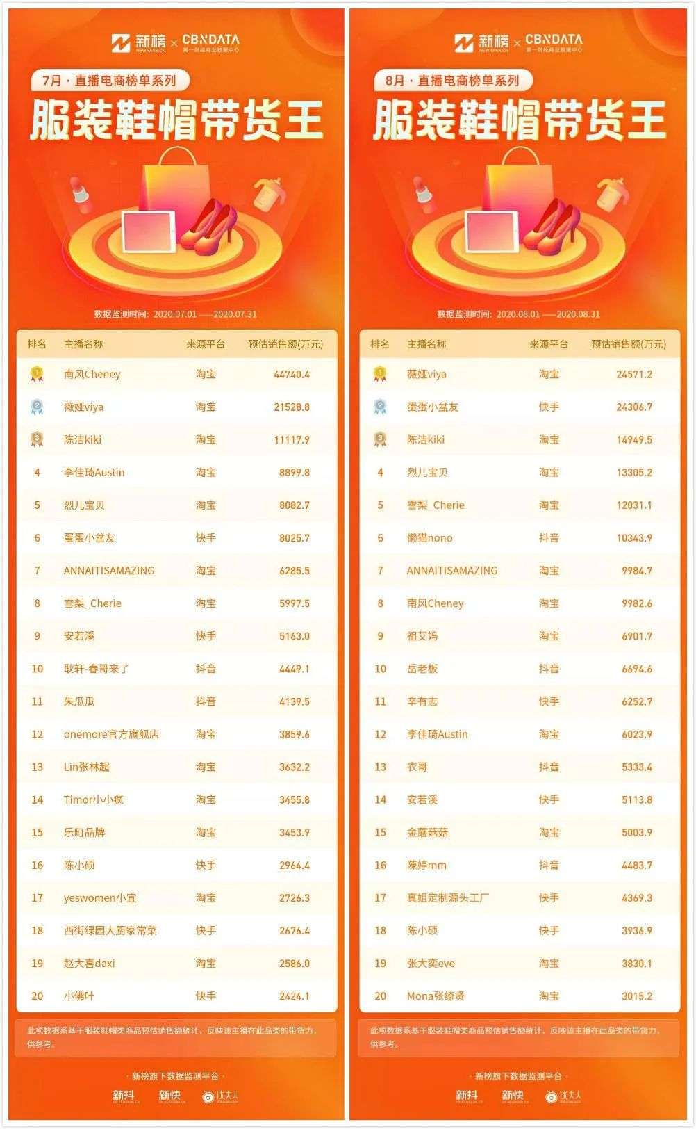 今年7月,服装鞋帽带货王TOP20的主播中,淘宝占了13席,且前五名全部来自淘宝,分别为南风Cheney、薇娅viya、陈洁kiki、烈儿宝贝、雪梨。