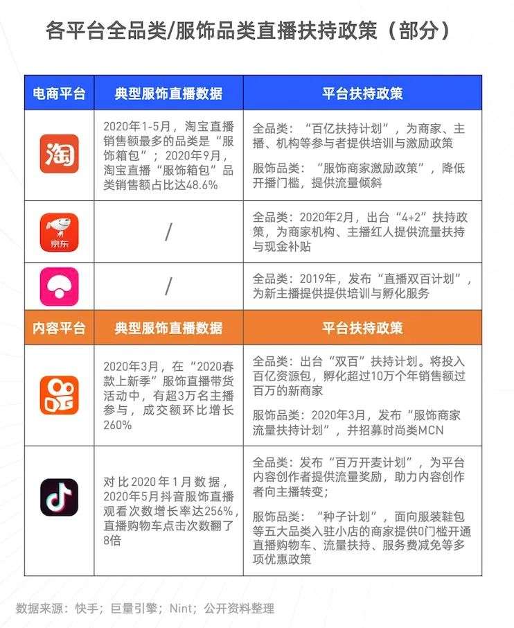 比如,淘宝出台“服饰商家激励政策”,降低开播门槛,为服饰主播提供流量倾斜;抖音发布“种子计划”,面向服装鞋包等五大品类入驻的商家,提供零门槛开通直播购物车、流量扶持、服务费减免等多项优惠政策;快手公开“服饰商家流量扶持计划”,针对新晋服饰品牌开启扶持,并招募时尚类MCN。