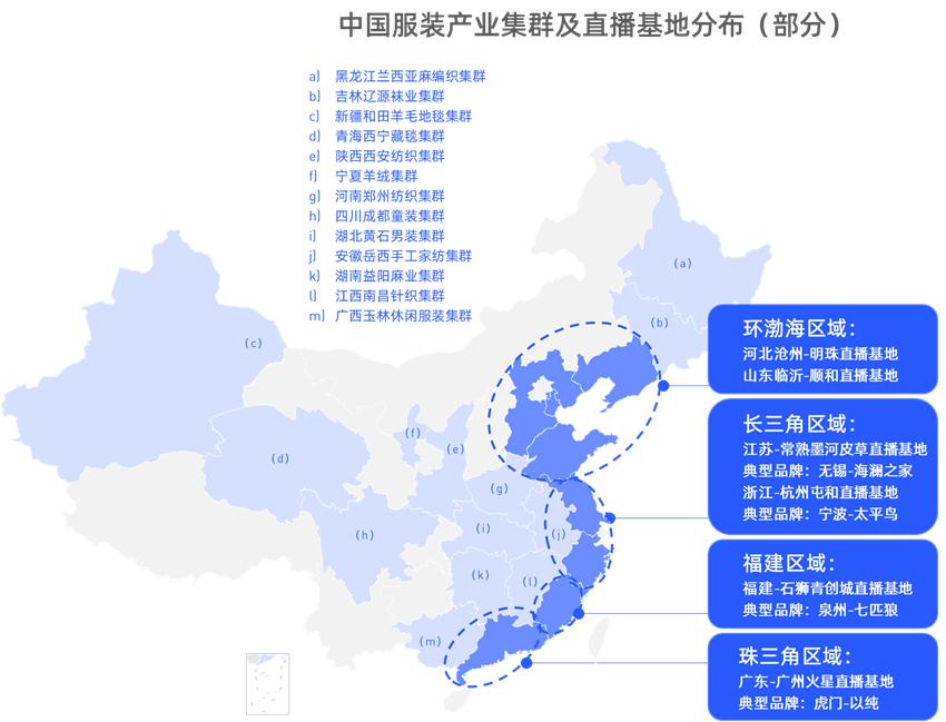 长三角区域,有江苏-常熟墨河皮草直播基地,典型品牌有无锡的海澜之家,还有浙江-杭州屯和直播基地,典型品牌有宁波的太平鸟。