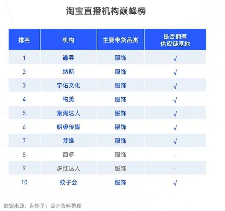 据不完全统计,淘宝直播排名前十且主要带货服饰品类的机构中,有八家拥有自建或注资的供应链货源基地。比如,头部MCN机构谦寻,在杭州筹建了“超级供应链基地”,覆盖服饰在内的全品类优质货源。
