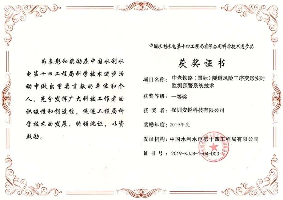 据安锐科技此前消息,由安锐科技研发的【中老铁路隧道风险工序变形实时监测预警系统】曾在2019年荣获中国水利水电第十四工程局颁发的科学技术进步一等奖。