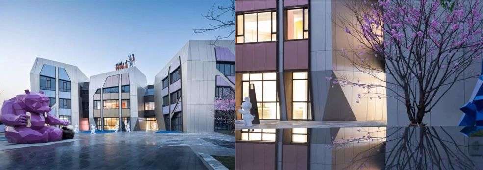 从外立面来看,浅灰色铝板与炫彩铝板结合,三种色彩的变换,从不同角度不同位置,都是不一样的一种观感,让整个项目都充满童趣