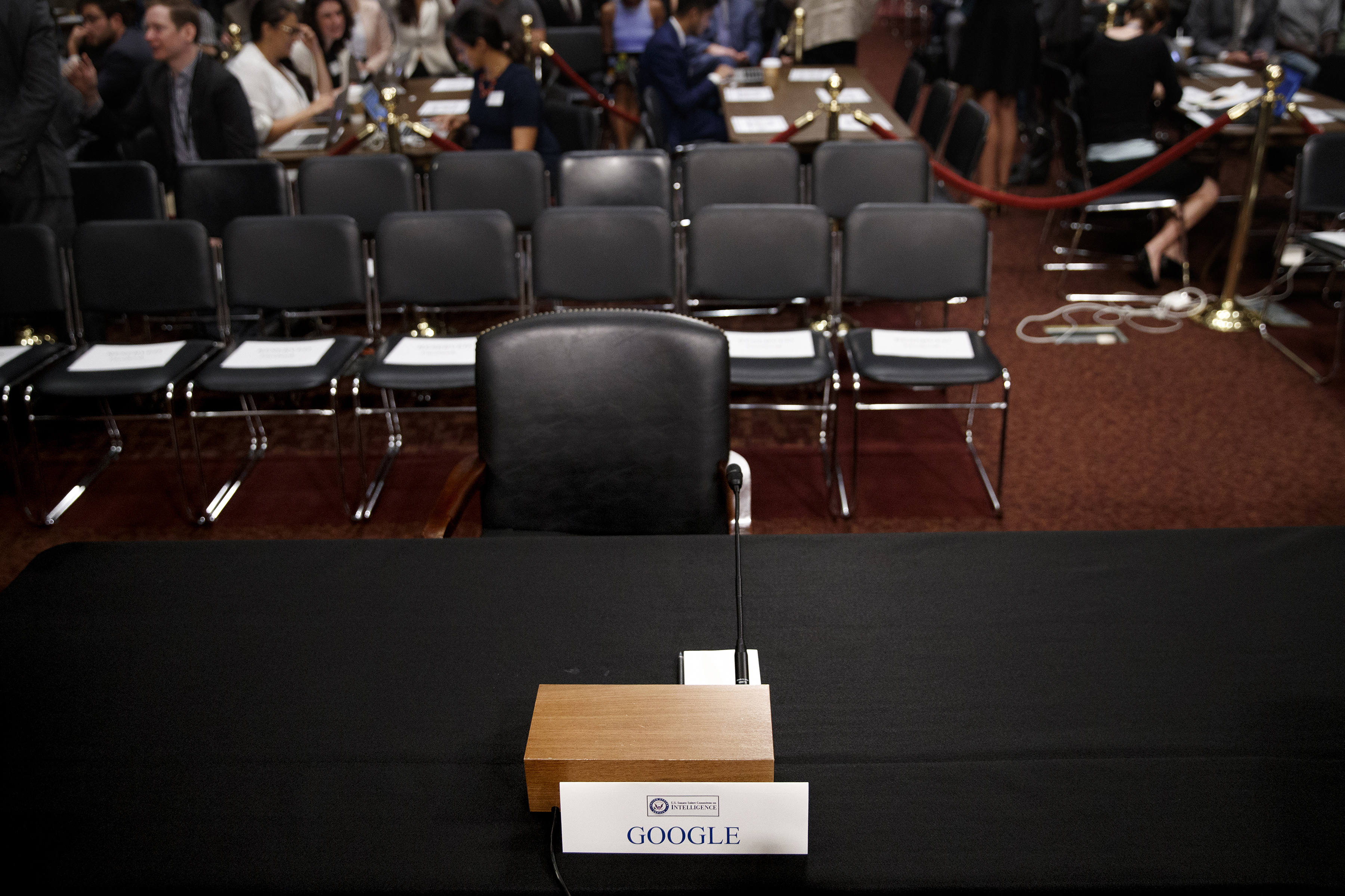 美国参议院情报委员会听证会上为谷歌留出的空位。图片来源:Tom Brenner/The New York Times