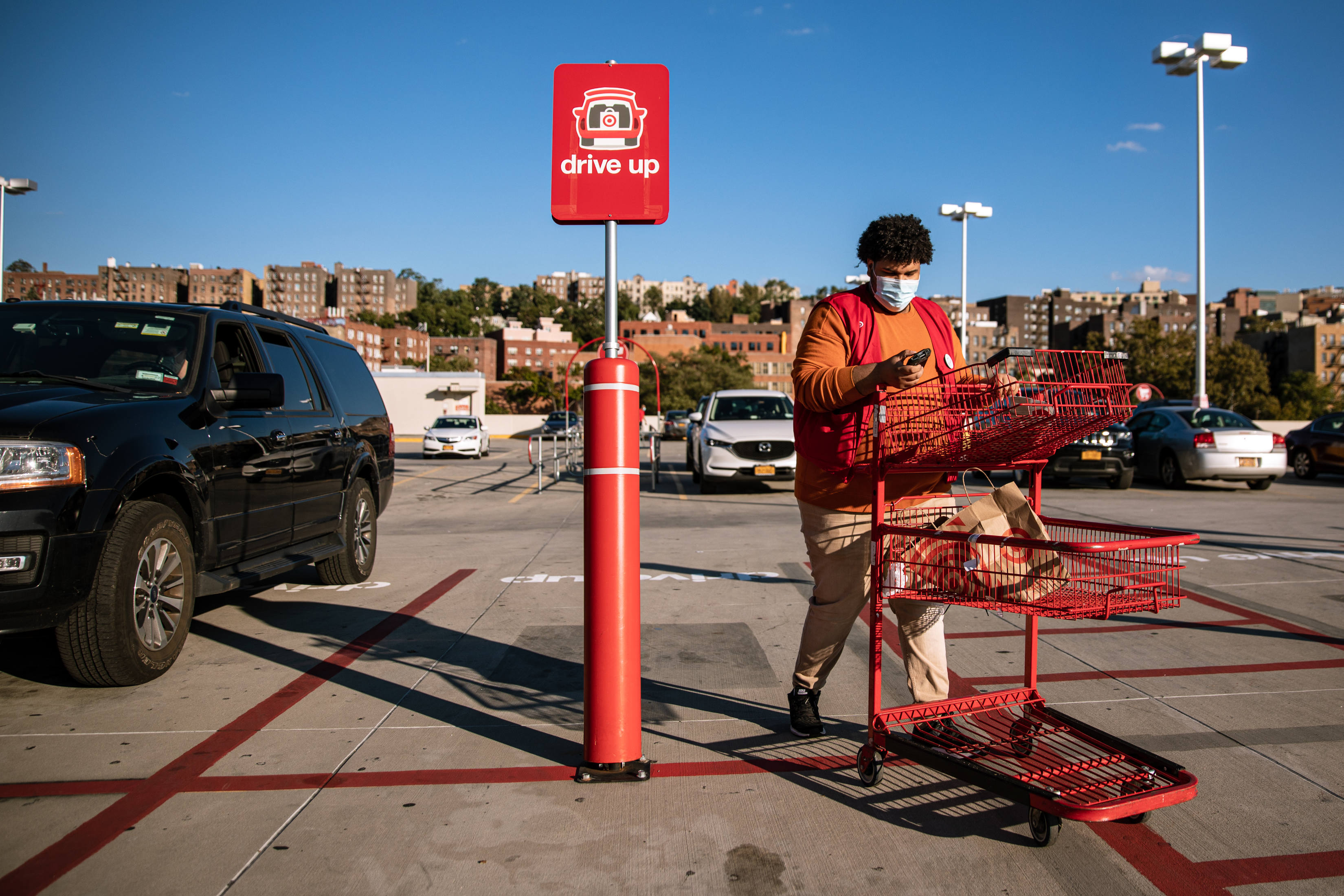 塔吉特员工Adrian Decena在门店外向顾客派送路边取货订单。图片来源:Amr Alfiky/The New York Times