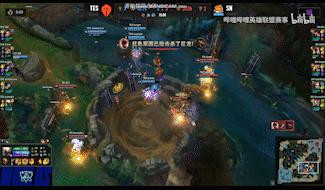19分钟盲僧再次阵亡,SN打出1换2拿下水龙听牌。TES随后找到机会击杀huanfeng的烬,TES趁热打铁顺势击杀中单成功拿下大龙,SN则选择奥恩绕后TP留住EZ。